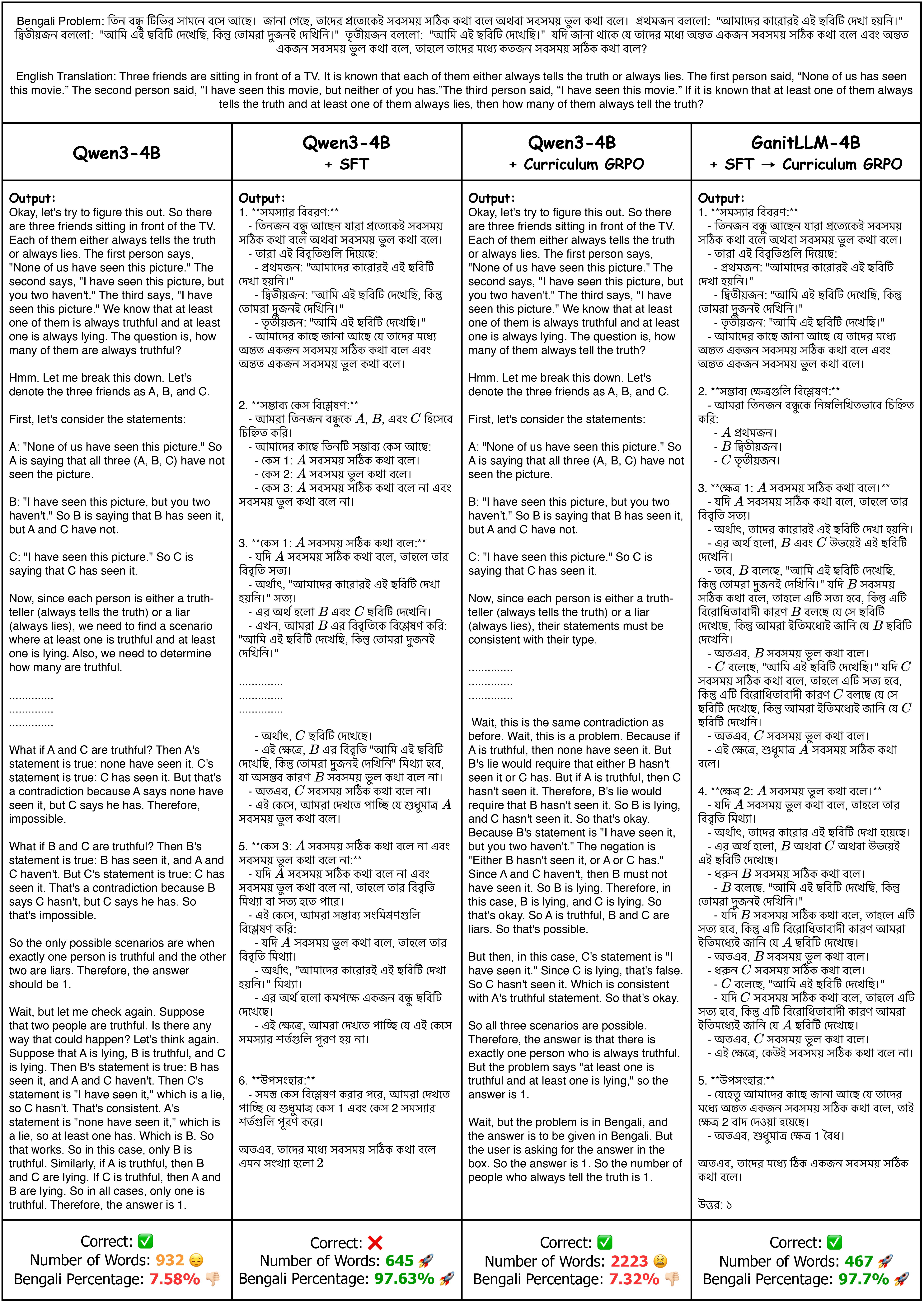 TL;DR: We build the first Bengali math reasoning LLM that actually thinks in Bengali — by combining a difficulty-aware dataset (GANIT) with a curriculum-based GRPO training recipe that solves the cold-start problem in low-resource RL.